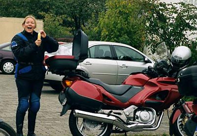 Klaudia, eine Banane aus dem Topcase zaubernd...